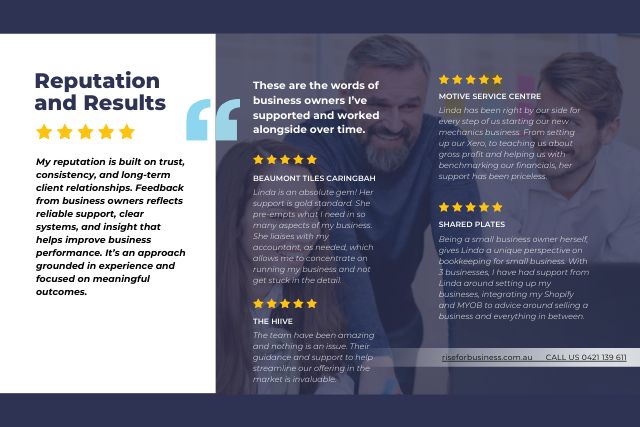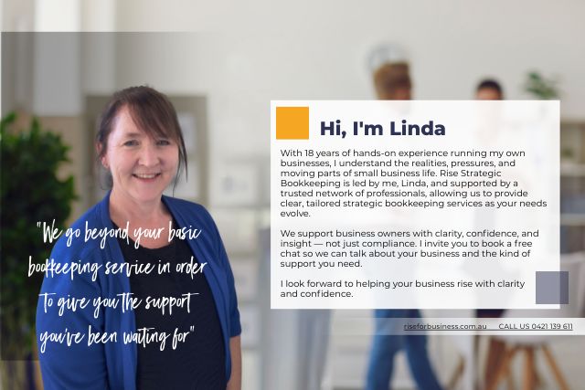 At Rise, I help business owners rise above the numbers, gain clarity, and turn insights into confident decisions. I work with you to set up systems that work, understand what your numbers are telling you, and give you the information you need to grow your business while keeping stress under control.